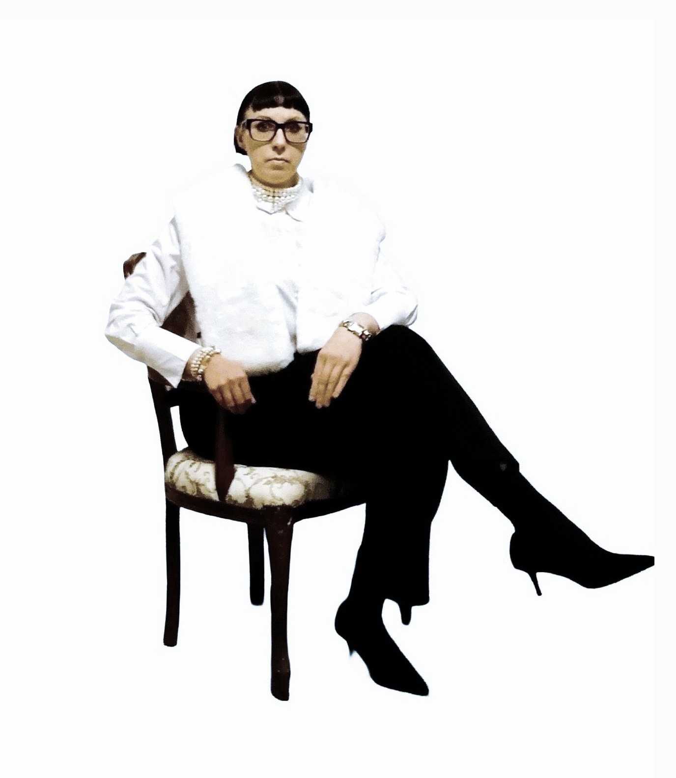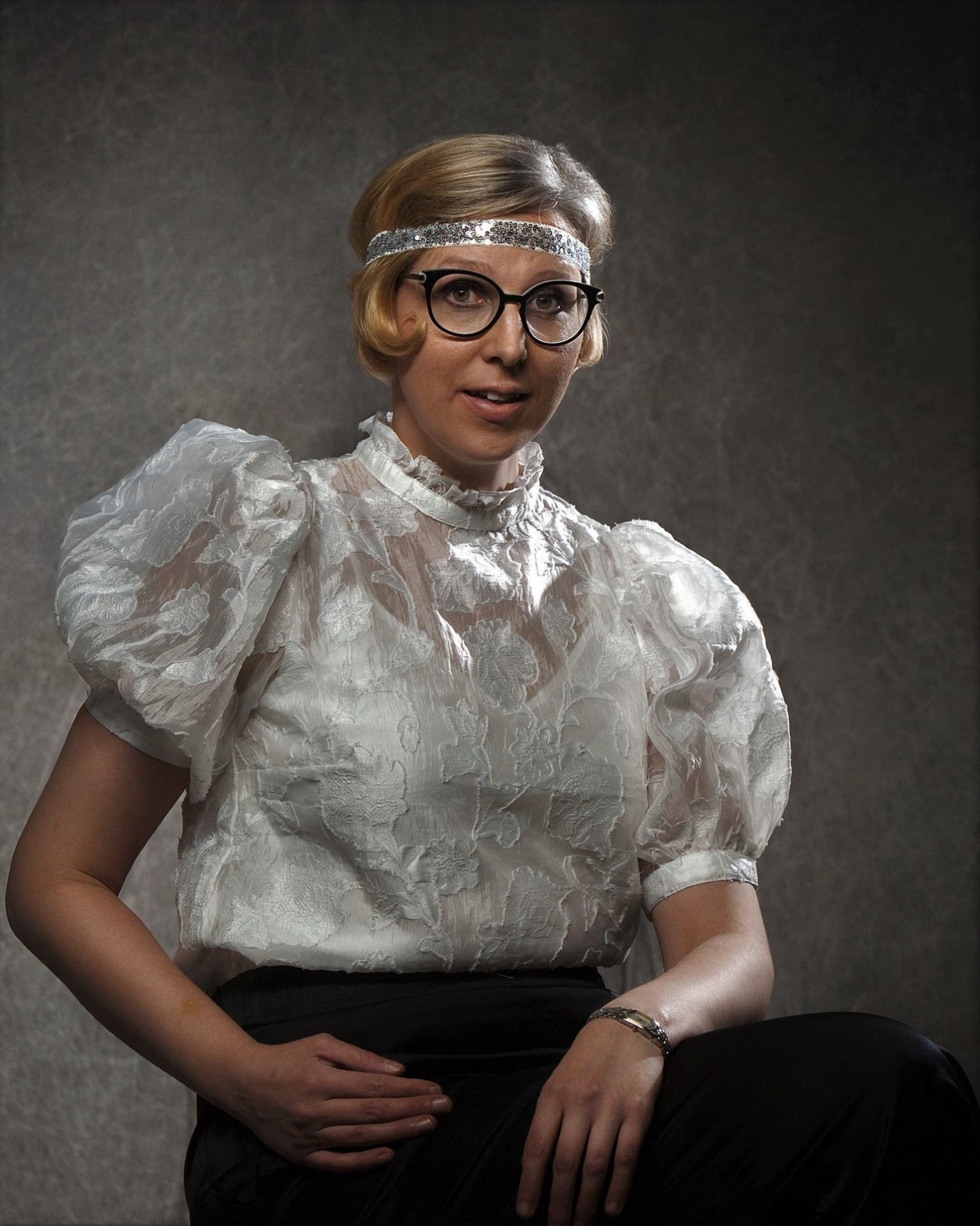 Musta 1920-lukuhenkinen hattu ja valkoisia helmiä, 2021.